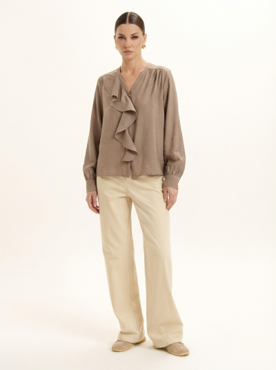 Блуза женская. Горловина оформлена воланом и тонкой планкой с застежкой на петли и пуговицы. По спинке и плечам переда обработаны кокетки со сборкой. Рукав втачной, с манжетой с застежкой на петлю и пуговицу.