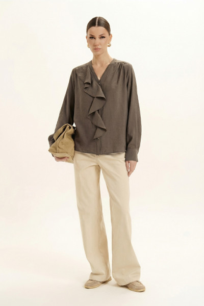 Блуза женская. Горловина оформлена воланом и тонкой планкой с застежкой на петли и пуговицы. По спинке и плечам переда обработаны кокетки со сборкой. Рукав втачной, с манжетой с застежкой на петлю и пуговицу.