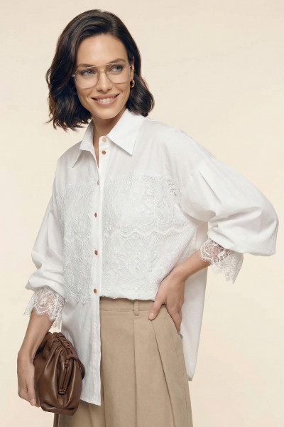 Блузка женская свободного покроя из хлопковой ткани. Вырез горловины оформлен воротником рубашечного типа с отрезной стойкой. Застёжка – планка на петли с пуговицами. Рукава – со спущенной линией плеча и мягкой глубокой складкой в области оката. Низа рукавов посажены на эластичную тесьму. Изделия декорировано французским кружевом.