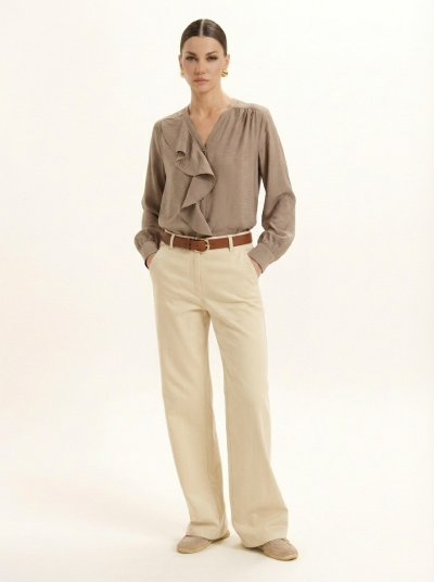 Блуза женская из легкой струящейся ткани. Горловина оформлена воланом и тонкой планкой с застежкой на петли и пуговицы. По спинке и плечам переда обработаны кокетки со сборкой. Рукав втачной, с манжетой с застежкой на петлю и пуговицу.