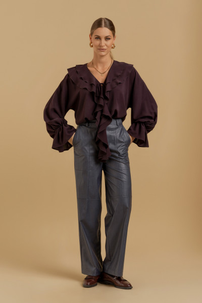 Брюки женские прямого силуэта из искусственной кожи на хлопковой основе. Пояс - отрезной с эластичной тесьмой и застежкой на брючный крючок. В боковых швах - карманы с отрезными бочками. Изделие декорировано подрезами. Есть шлевки для ремня.