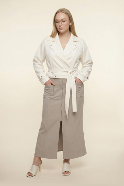 Комплект женский двухпредметный из джинсовой ткани. Жакет – укороченный, свободного покроя. Вырез горловины оформлен воротником пиджачного типа. Застёжка – двубортная на кнопки. Рукава – покроя реглан. В вертикальных рельефах переда выполнены карманы с настрочными листочками. Изделие декорировано съемными патами на рукавах и поясом по низу жакета. Декоративные элементы съемные. Юбка - прямого силуэта с застёжкой – молнией спереди. Пояс – частично отрезной с эластичной тесьмой. Спереди и сзади изделия выполнены вертикальные подрезы. На передних половинках – настрочные карманы.