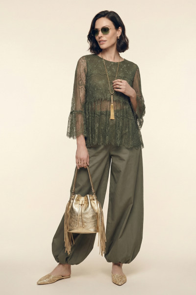 Комплект женский двухпредметный. Блузка выполнена из французского кружева. Вырез горловины – неглубокий, круглой формы. Рукава – втачные с эластичной тесьмой внизу. Под грудью выполнен декоративный подрез, в который вставлен волан со сборкой. Брюки – прямые от бедра из хлопковой ткани. Пояс – отрезной с эластичной тесьмой. На задних половинках брюк – настрочные карманы. На передних половинках – карманы закругленным входом. В поясе брюк имеются шлёпки для ремня.