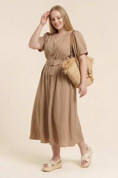 Платье женское приталенного силуэта из вискозной ткани. Вырез горловины- углубленный V-образной формы. Застежка-на петли с пуговицами. Рукава- втачные со сборкой внизу и в области оката. Низ рукава посажен на манжет. По линии талии проложена эластичная тесьма. В боковых швах имеются карманы. Изделие дополнено съемным поясом из основной ткани. Пуговицы и пряжка обтянуты тканью.