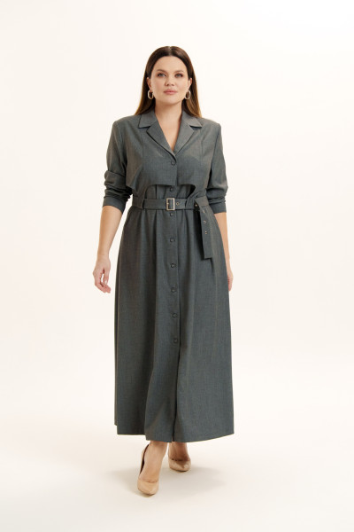Платье женское А-силуэта из костюмной ткани. Вырез горловины оформлен воротником пиджачного типа с застежкой на петли с пуговицами. Рукава - втачные. В боковых швах выполнены карманы. Спереди и сзади изделие декорировано кокетками сложной архитектурной формы. При помощи пояса из основной ткани возможно создать приталенный силуэт.