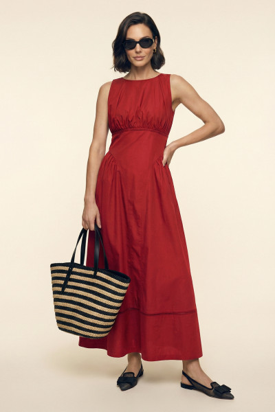 Платье женское притатенного силуэта из хлопковой ткани. Вырез горловины - неглубокий в форме лодочки. Верх посажен на хлопковую подкладку. Декоративные фигурные подрезы со сборкой выгодно подчеркивают линию бедер и линию груди. Застежка - потайная молния в боковом шве. Изделие декорировано ажурной тесьмой в тон основной ткани.