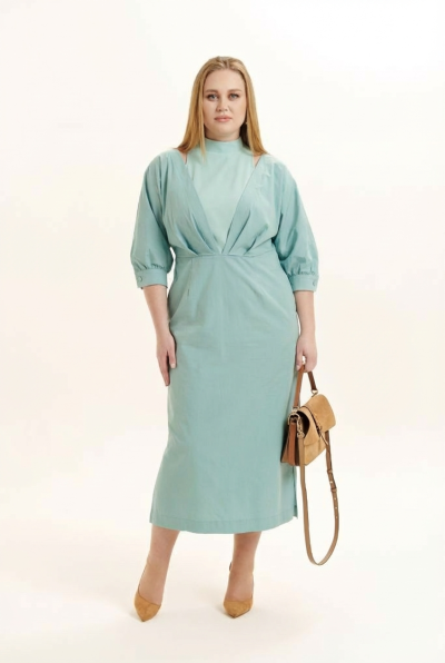 Красивое, стильное и элегантное платье прямого силуэта выполнено из хлопкового полотна и элит трикотажа. Модель платья классика с рукавом 3/4 ЛЕТУЧАЯ МЫШЬ, низ рукава на манжете. Горловина оформлена воротником - стойка из отделочной ткани с застежкой по спинке на потайную молнию , что делает платье универсальным нарядом в гардеробе любой женщины или девушки. На платье обработан подрез со складками. По боковому шву разрез.