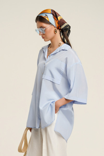 Блуза женская свободного прямого кроя. Воротник рубашечный, застежка на петли и пуговицы. Рукав отрезной на базе цельнокроеного, короткий. По переду имитация накладного кармана. По спинке кокетка с бантовой складкой и декоративной патой. В боковых швах разрезы.