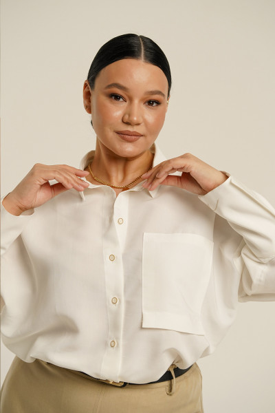 Блуза женская свободного прямого кроя. Воротник рубашечный, застежка на петли и пуговицы. Рукав отрезной на базе цельнокроеного, длинный с широкой манжетой. На одной манжете декоративная вышивка. По переду имитация накладного кармана. По спинке кокетка с бантовой складкой и декоративной патой. В боковых швах разрезы.