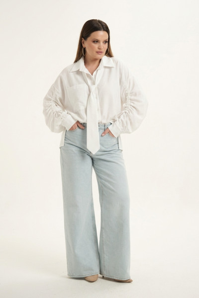 Блуза свободного покроя из хлопковой ткани . Горловина оформлена воротником рубашечного типа. Застежка-планка с петлями и пуговицами. На спинке - кокетка с планкой и закрепками. Рукава - втачные со спущенной линией плеча, снизу -манжеты с застежкой на петли с пуговицами и кулисой по рукаву. По переду с одной стороны обработан накладной карман. В комплект входит съемный галстук.