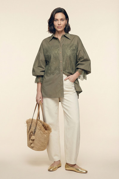 Блузка женская свободного покроя из хлопковой ткани. Вырез горловины оформлен воротником рубашечного типа с отрезной стойкой. Застёжка – планка на петли с пуговицами. Рукава – со спущенной линией плеча и мягкой глубокой складкой в области оката. Низа рукавов посажены на эластичную тесьму. Изделия декорировано французским кружевом.