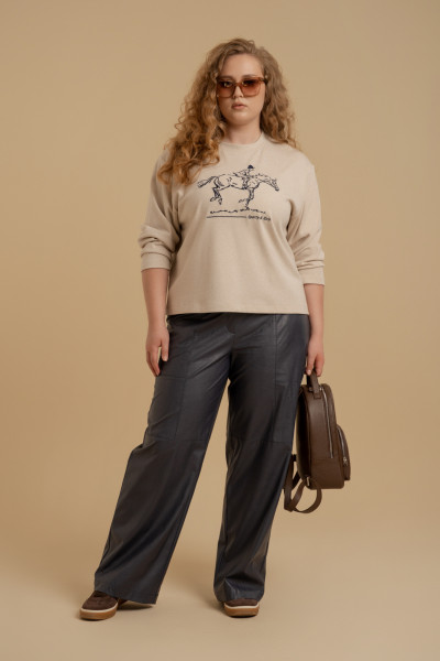 Брюки женские прямого силуэта из искусственной кожи на хлопковой основе. Пояс - отрезной с эластичной тесьмой и застежкой на брючный крючок. В боковых швах - карманы с отрезными бочками. Изделие декорировано подрезами. Есть шлевки для ремня.