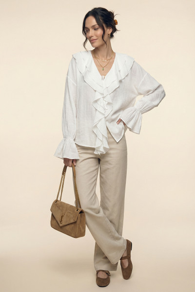 Брюки - прямые из легкой джинсовой ткани. Пояс - отрезной с застежкой на молнию и петлю с пуговицей. Имеются карманы с отрезными бочками и шлевки для ремня. На заднем полотнище обработаны кокетки и накладные карманы. Отделочная фурнитура может меняться.
