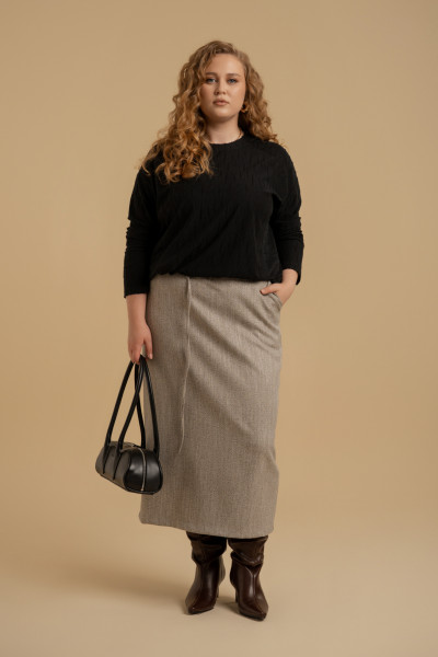 Джемпер женский свободного покроя из трикотажного полотна с эффектом спущенных петель. Вырез горловины неглубокий округлой формы. Рукава отрезные на базе цельнокроеных. Перед изделия оформлен декоративными подрезами в виде кокеток и рельефов. В подгибку низа вставлена эластичная тесьма с фиксаторами в боковых швах.