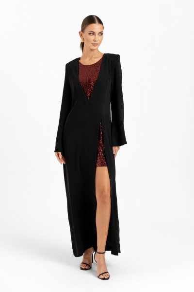 Комплект женский двухпредметный. Платье без рукавов из ткани с пайетками на трикотажной подкладке. Вырез горловины - неглубокий округлой формы. Туника - свободного покроя из плательной ткани. Вырез горловины - V-образной формы, углубленный. Спереди слева - высокий разрез. Рукава - втачные с плечевыми накладками.