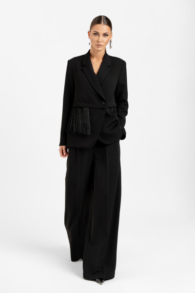 Комплект женский двухпредметный из плательно-костюмной ткани. Жакет полуприлегающего силуэта на подкладке. Вырез горловины оформлен воротником пиджачного типа с двубортной застежкой на петли с пуговицами. Рукава - втачные двухшовные с плечевыми накладками. В области линии талии выполнен подрез в виде планки. Жакет декорирован съемным элементом в виде бахромы с пайетками. Брюки - палаццо со стрелками. Пояс - отрезной с застежкой на молнию и петлю с пуговицей, частично вставлена эластичная тесьма. Имеются карманы с отрезными бочками и шлевки для ремня.