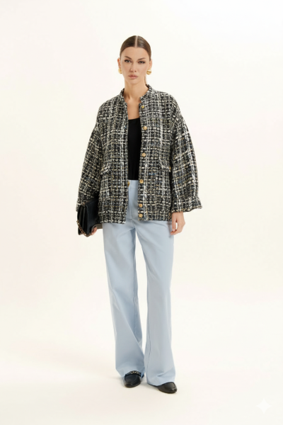 Костюм женский двухпредметный на подкладке. Выполнен из двух видов ткани (твид и джинс). Жакет - бомбер на поясе с резинкой по низу изделия и стойкой по горловине. На полочке обработаны накладные карманы с клапаном. Застежка по борту на петли и пуговицы. Слегка спущенный и расширенный рукав. Брюки - прямые. Пояс - отрезной с застежкой на молнию и петлю с пуговицей. Имеются карманы с отрезными бочками и шлевки для ремня. На заднем полотнище обработаны кокетки и накладные карманы. Отделочная фурнитура может меняться.