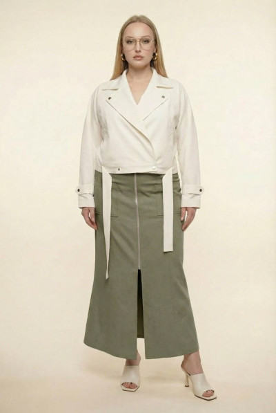 Комплект женский двухпредметный из джинсовой ткани. Жакет – укороченный, свободного покроя. Вырез горловины оформлен воротником пиджачного типа. Застёжка – двубортная на кнопки. Рукава – покроя реглан. В вертикальных рельефах переда выполнены карманы с настрочными листочками. Изделие декорировано съемными патами на рукавах и поясом по низу жакета. Декоративные элементы съемные. Юбка - прямого силуэта с застёжкой – молнией спереди. Пояс – частично отрезной с эластичной тесьмой. Спереди и сзади изделия выполнены вертикальные подрезы. На передних половинках – настрочные карманы.