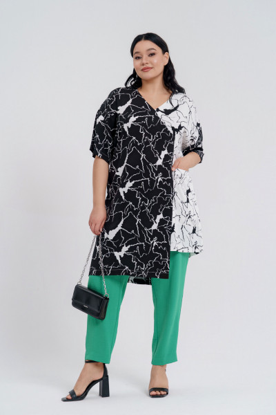 Туника свободного покроя из легкой вискозной ткани двух цветов. Вырез горловины V-образный с имитацией запаха. Рукава- отрезные на базе спущенного. По переду слева накладной карман. Низ асимметричный с шлицами по переду и спинке.