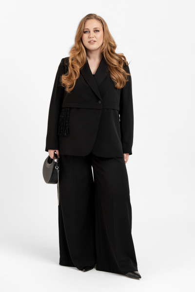 Комплект женский двухпредметный из плательно-костюмной ткани. Жакет полуприлегающего силуэта на подкладке. Вырез горловины оформлен воротником пиджачного типа с двубортной застежкой на петли с пуговицами. Рукава - втачные двухшовные с плечевыми накладками. В области линии талии выполнен подрез в виде планки. Жакет декорирован съемным элементом в виде бахромы с пайетками. Брюки - палаццо со стрелками. Пояс - отрезной с застежкой на молнию и петлю с пуговицей, частично вставлена эластичная тесьма. Имеются карманы с отрезными бочками и шлевки для ремня.