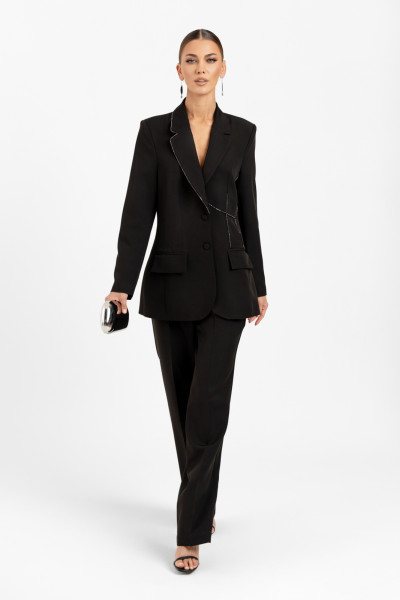 Комплект женский двухпредметный из плательно-костюмной ткани. Жакет полуприлегающего силуэта на подкладке. Вырез горловины оформлен воротником пиджачного типа с застежкой на петли с пуговицами. Рукава - втачные двухшовные с плечевыми накладками. Спереди - прорезные карманы с клапанами. Перед изделия и правый борт декорирован ассиметричными подрезами с кантом из страз. Брюки - прямые от бедра со стрелками. Пояс - отрезной с застежкой на молнию и петлю с пуговицей, частично вставлена эластичная тесьма. Имеются карманы с отрезными бочками и шлевки для ремня. Отделочная фурнитура может меняться. Пуговицы обтянуты основной тканью.