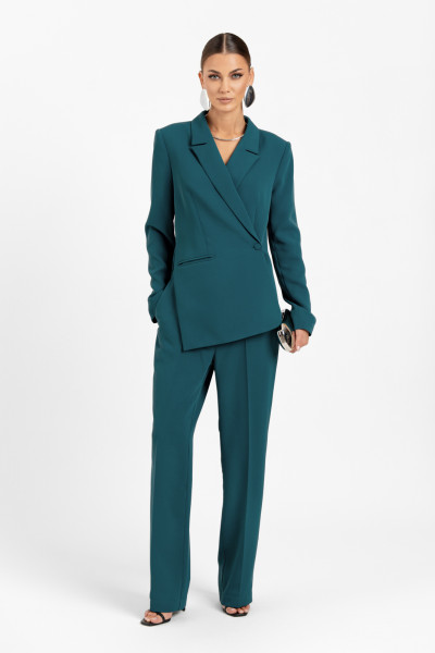 Комплект женский двухпредметный из плательно -костюмной ткани. Жакет - полуприлегающего силуэта на подкладке. Вырез горловины оформлен воротником пиджачного типа со смещенной застежкой застежкой на петлю с пуговицей. Рукава - втачные двухшовные с плечевыми накладками. В правом боковом шве - высокий разрез, имеется прорезной карман справа. Брюки - прямые от бедра со стрелками. Пояс - отрезной с застежкой на молнию и петлю с пуговицей, частично вставлена эластичная тесьма. Имеются карманы с отрезными бочками и шлевки для ремня. Пуговицы обтянуты основной тканью.
