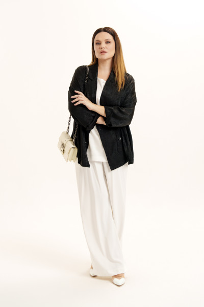 Жакет без подкладки прямого силуэта, застежка двубортная на петли и пуговицы. Воротник пиджачного типа. Рукав отрезной на базе цельнокроеного, по низу манжет. Дополнен съемным украшением.