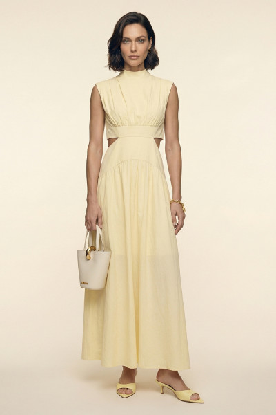 Платье женское приталенного силуэта из хлопковой ткани с эффектом "крэш". Вырез горловины оформлен воротником-стойкой. Застежка со стороны спинки в среднем шве на молнию в области талии и петлю с пуговицей в воротнике. Изделие посажено на хлопковую подкладку. По бокам- декоративные элементы в виде прорезей. На верхней части и юбке выполнена мягкая сборка. Длина спинки от линии горловины - 146 см.