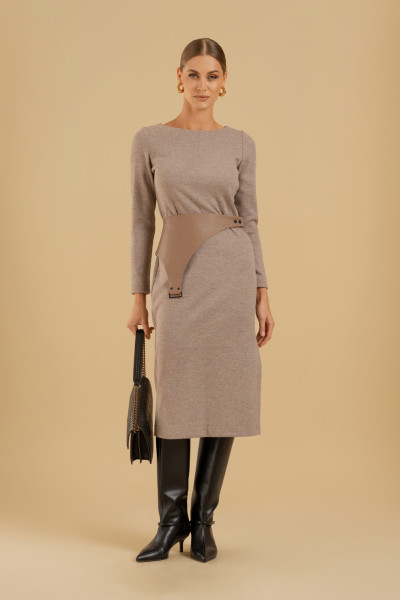 Платье женское из трикотажного полотна облегающего силуэта. Вырез горловины - неглубокий, формы лодочка. Рукава - втачные. Сбоку выполнен разрез. Платье дополнено съемной баской из искусственной кожи. В качестве декора служит фурнитура контрастного цвета.