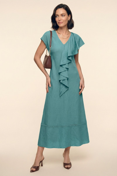 Платье женское А-силуэта из вискозной ткани. Линия плеча - спущенная. Платье декорировано воланом ассиметричной формы и ажурной тесьмой по низу изделия.
