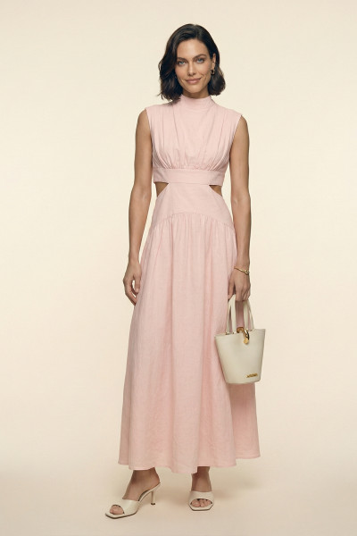Платье женское приталенного силуэта из хлопковой ткани с эффектом "крэш". Вырез горловины оформлен воротником-стойкой. Застежка со стороны спинки в среднем шве на молнию в области талии и петлю с пуговицей в воротнике. Изделие посажено на хлопковую подкладку. По бокам- декоративные элементы в виде прорезей. На верхней части и юбке выполнена мягкая сборка. Длина спинки от линии горловины - 146 см.