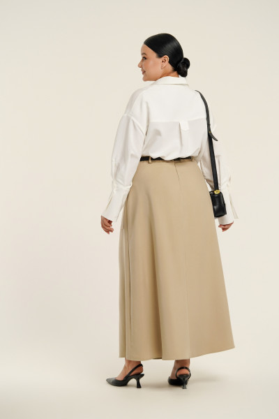 Юбка А-силуэта. По переду встречная складка, слева накладной карман с клапаном. Застежка на потайную молнию и петлю с пуговицей. Пояс отрезной с вставками эластичной тесьмы.
