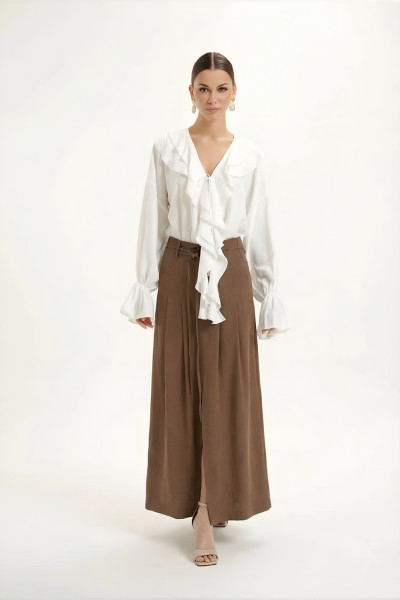 Юбка женская из легкой , струящейся ткани "тенсел", юбка длинны миди с карманами в боковых швах и складками по переду. Пояс со шлевками и застежкой на молнию и петлю и пуговицу. По центру переднего полотнища обработан разрез. Юбка декорирована съемным шнуром из основной ткани.