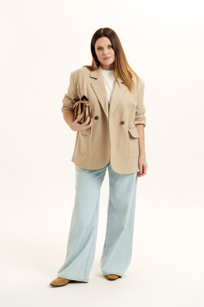 Жакет прямого покроя из мягкого трикотажного полотна. Вырез горловины оформлен воротником пиджачного типа с двубортной застежкой на петли с пуговицами. Рукава - втачные с расширенной линией плеча. Усилены плечевыми накладками. На передних половинках - настрочные карманы с цельнокроеными отворотами, имитирующими клапаны. Перед изделия посажен на подкладку.
